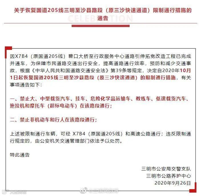 因X7B4(原国道205线)碧口大桥至行政服务中心道路引伸拓宽改造工程已完成并通车,决定自2020年10月1日起恢复国道205线三明至沙县路段(原三沙快速通道)的限制通行措施。禁止大、中型载货汽车、挂车、危险化学品运输车、教练车、低速载货汽车、拖拉机和摩托车(超标电动车)在该路段通行;禁止非机动车和行人在该路段通行。