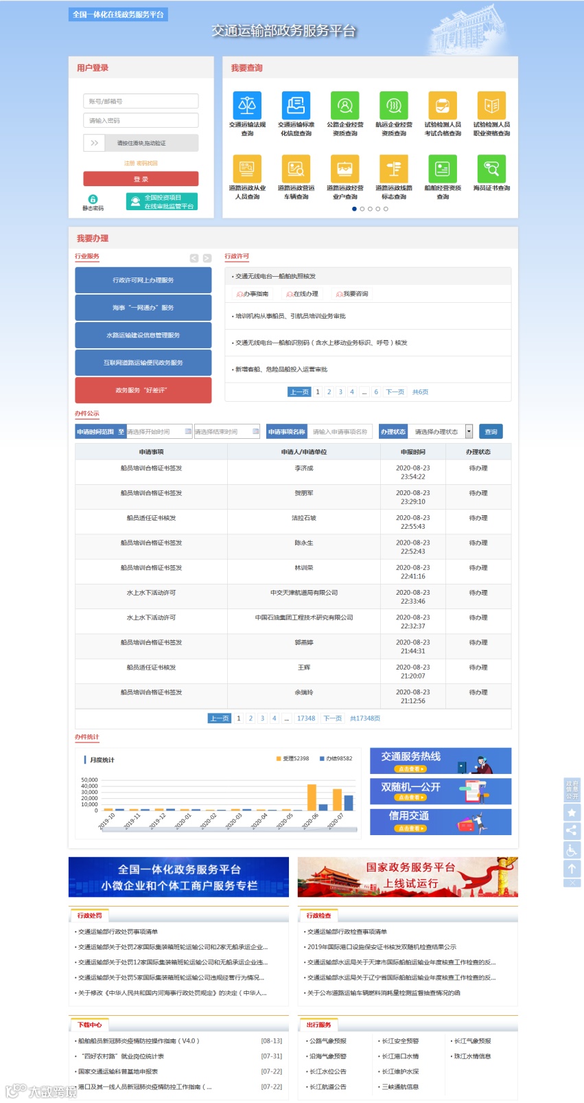 此次改版集中改造了交通运输部行政许可办理系统、海事系统一网通办平台、水路运输建设信息管理服务、互联网道路运输便民政务服务平台等高频业务应用系统的统一身份认证功能,法人和个人用户在门户上一次登录,就可以跨平台办理相关业务,有效解决用户进多站、跑多网等问题。目前平台已经拥有约35000个实名注册用户,2020年以来事项办结量已经达到61000余件。