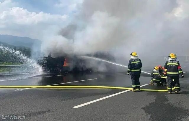 7月21日14时30分许,金华市消防救援支队指挥中心接到报警称,仙桥立交上高速往衢州方向200米左右,一辆装29.5吨柴油的油罐车发生起火,情况十分危急。到达现场后,消防员发现油罐车的车头已被熊熊烈火包围,并有逐渐向油罐罐体蔓延趋势。经过约10分钟扑救,火势被彻底扑灭,消防救援人员继续使用水枪对罐体进行持续冷却,确保罐体不再发生危险。