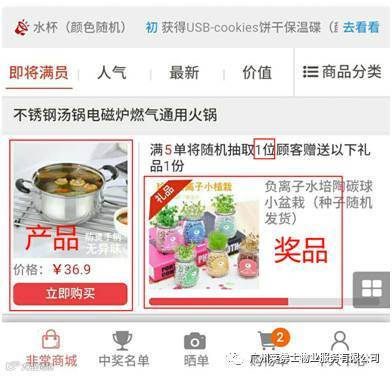 比如上面的不锈钢汤锅,只要购买人数满5人,系统就会对此5位客户随机抽取1位幸运儿赠送负离子小盆栽。