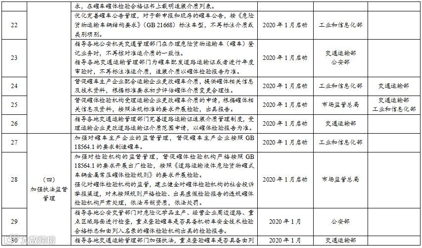 (一)强化部门协作分工。罐车治理工作涉及面广,专业性强,情况复杂,各地相关部门要在地方政府的统一领导下,通力合作、精心准备、协调行动,将罐车治理作为防范化解重大风险的举措和一项重要工作内容,进行统一部署,共同推进实施。相关行业协会应配合政府管理部门做好宣传引导工作。
