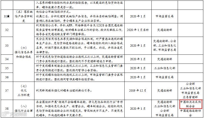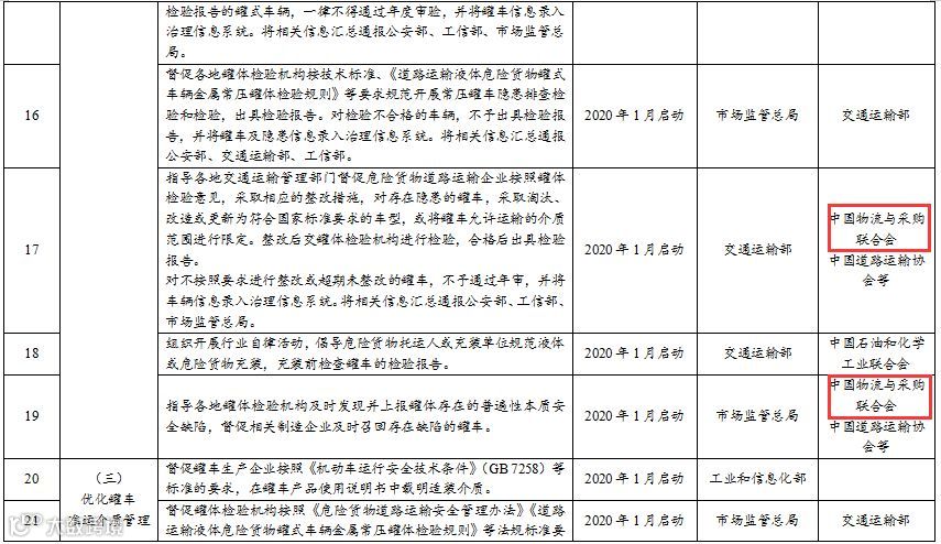 (四)强化行业自律。依托中国物流与采购联合会、中国道路运输协会、中国石油与化学工业联合会、全国危险货物运输服务联盟等在全国组织开展“拒绝不合格罐车运输,净化危险品物流行业”专项活动,加强与危化品生产、经营企业,罐车制造企业,检验机构及危险货物道路运输企业的沟通交流,督促相关方不生产、不使用违规罐车,不向违规罐车中充装介质,回归公平竞争的市场环境,营造良好社会氛围。中国物流与采购联合会、中国道路运输协会、中国石油与化学工业联合会、全国危险货物运输服务联盟等广泛收集不规范开展检验的罐体检验机构、不依照标准进行设计制造的罐车生产企业、使用不具备有效罐体检验报告的罐车进行运输的企业、为不具有有效罐体检验报告的罐车充装货物的化工企业等违规企业名单,并及时向有关部门报告。