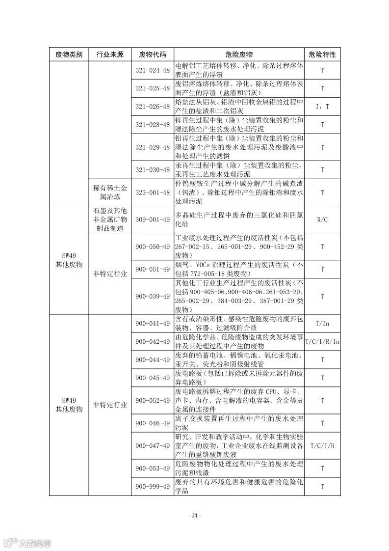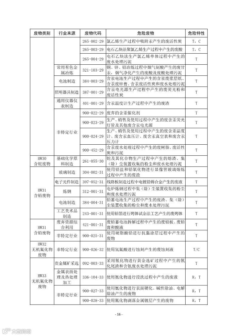 附表:国家危险废物名录