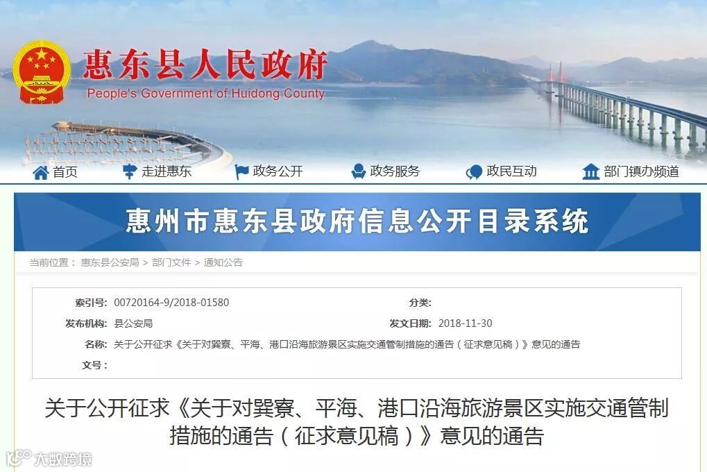 去年惠东县公安局已经在惠东县人民政府官网,挂出《关于对巽寮、平海、港口沿海旅游景区实施交通管制措施的通告(征求意见稿)》(以下简称《通告》),向社会公开征集意见(注:征集意见时间已截止),而主要内容为拟节假日在巽寮、平海以及港口沿海景区实行全天候单双号限行。