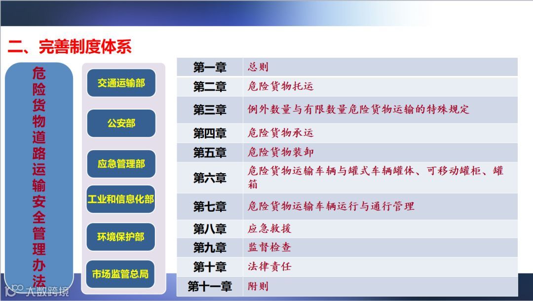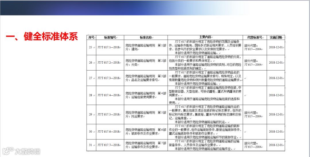 刚才张会长也说到我们颁布实施了危险货物道路运输规则这个标准,这个标准参照ADR,包括七大部分。总共40多万字,涵盖所有的危险品、环节和要素要求,任何一个危险品都能够找到对应的运输条件、包括包装标签、车辆装卸、应急等等。