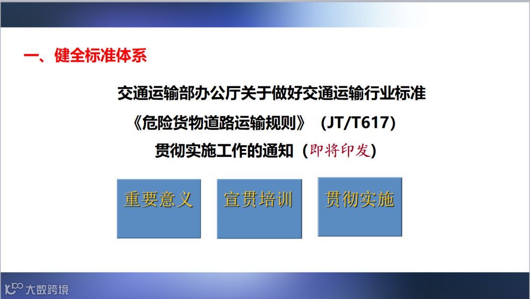 其中,宣贯培训这边主要包括两个层面,希望各地交通运输管理部门组织好宣贯培训,宣贯培训的对象主要包括管理人员,以及相关企业的人员。同时,我们在标准里面也写到鼓励支持中物联以及相关的科研机构和协会组织开展宣贯培训工作,为大家提供技术支撑。