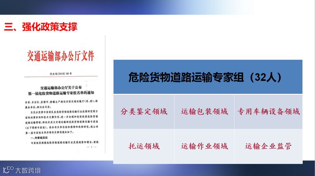 大家都知道我们这个工作技术性比较强,所以我们在以上的技术当中离不开专家的支持,所以我们借鉴欧洲国际先进的经验,成立了一个危险货物运输专家组,这个专家组总共包括6个领域,32个人,基本上涵盖了危险货物道路运输管理的全环节,我们下一步就需要把这个工作组来依托好、用好,支持我们开展相关政策的制定工作,提升我们决策的科学家水平。