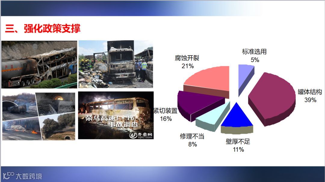另外一项工作就是要开展罐车治理,刚才给大家说,罐车是我们运输很重要的一个装备,但是近几年发生的事故很多都是它引起的,而且具有关监测机构的调查显示,我们的罐车问题还真的是不少。
