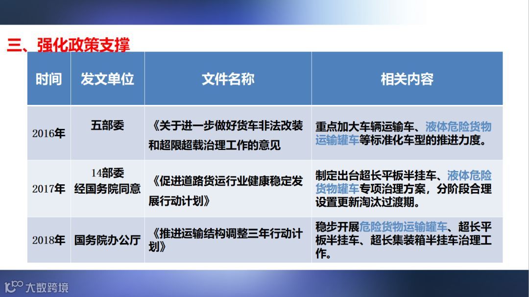 到现在还有一些不达标的罐车,从生产厂家涌入到运输市场,给市场管理造成了很大的隐患,所以我们需要解决这个问题。2016年,2017年,2018年的文件里面,都对罐车治理提出了要求,2016年的时候提出加大危险货物运输罐车的标准化车型的推进力度,2017年在交通运输部等14个部门,联合发布的促进道路行业健康稳定发展行动计划里面明确要制定出台液体危险货物罐车专项治理方案,分阶段合理设置更新淘汰过度期。