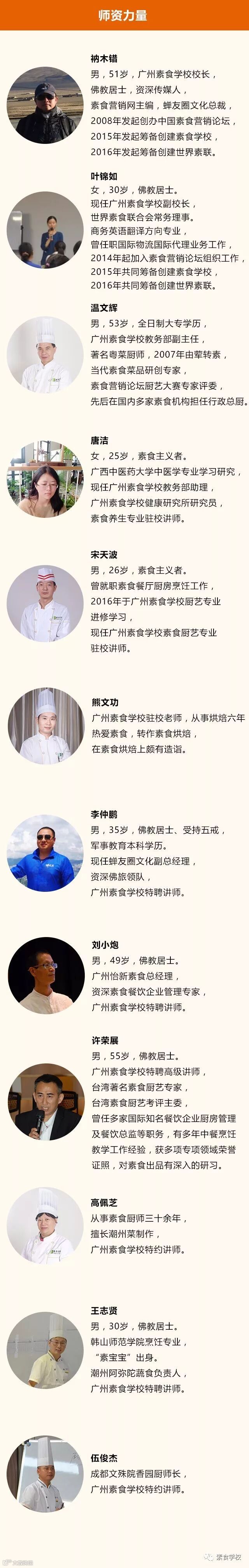 学校聘请海内外素食专家释亦智、刘小炮、黄昌玲、冯霞、许荣展、甘信超、王玮、李洪泽、黄建会、周星瑞、姚坤、马伟、白彦峰、伍俊杰、王立军等为讲师。