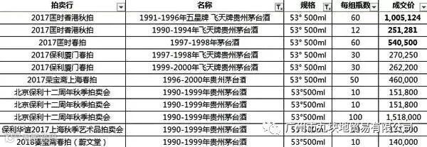 目前90年代的酒,拍卖场上表现最佳的为96年铁盖,网友整理了一组拍卖数据,供大家参考。