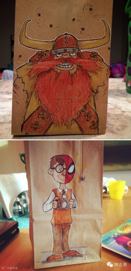 从2009年起,美术设计师David Laferriere就一直在他孩子的午餐袋上作画。他用记号笔在上面画出了很棒的照片蒙太奇。