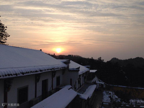 图片:冬日九华,日出照西天,白雪覆禅房。