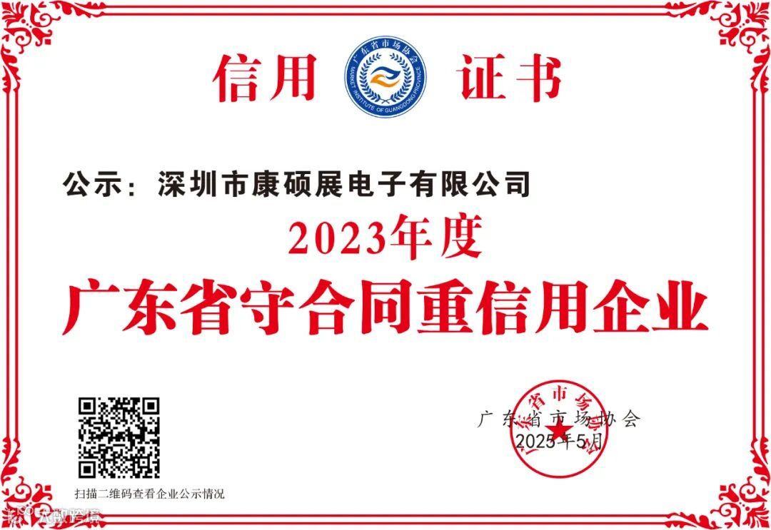 近日,广东省市场协会公示了2023年度第一批“守合同重信用企业”名单,康硕展荣获“广东省守合同重信用企业”称号。连续5年获此殊荣,是对我司在诚信经营、履约守信等方面的高度认可。