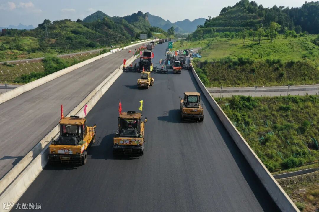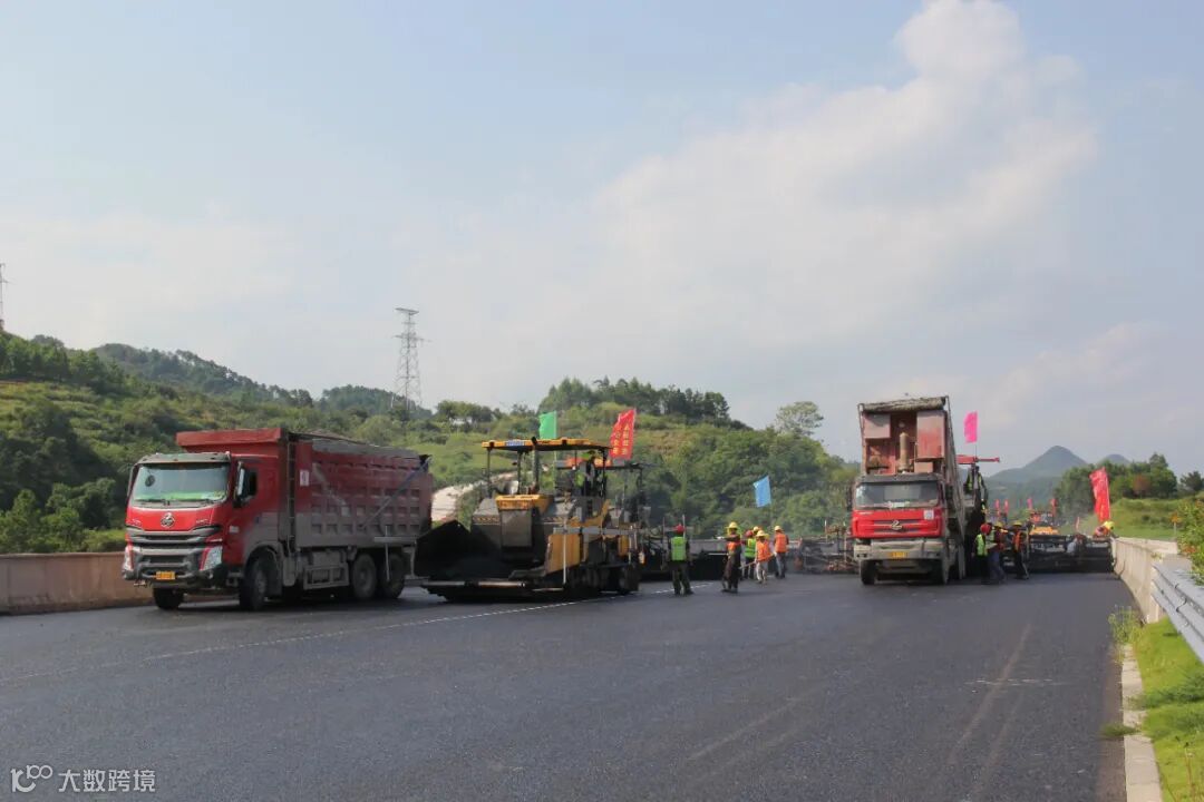 ▲ 烈日炎炎,路面摊铺如火如荼