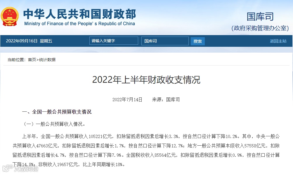 近日,我国财政部公布了《2022年上半年财政收支情况》统计数据。