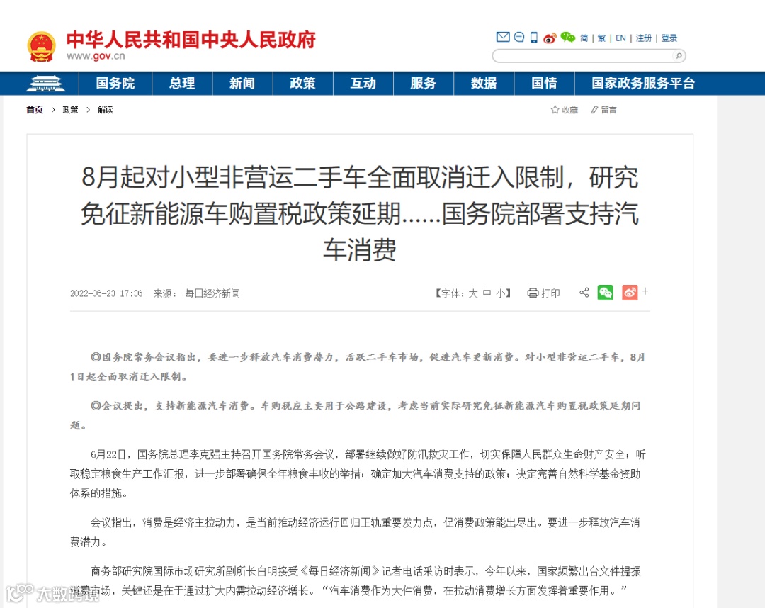 国务院常务会议指出,要进一步释放汽车消费潜力,活跃二手车市场,促进汽车更新消费。对小型非营运二手车,8月1日起全面取消迁入限制,10月1日起转移登记实行单独签注、核发临时号牌。