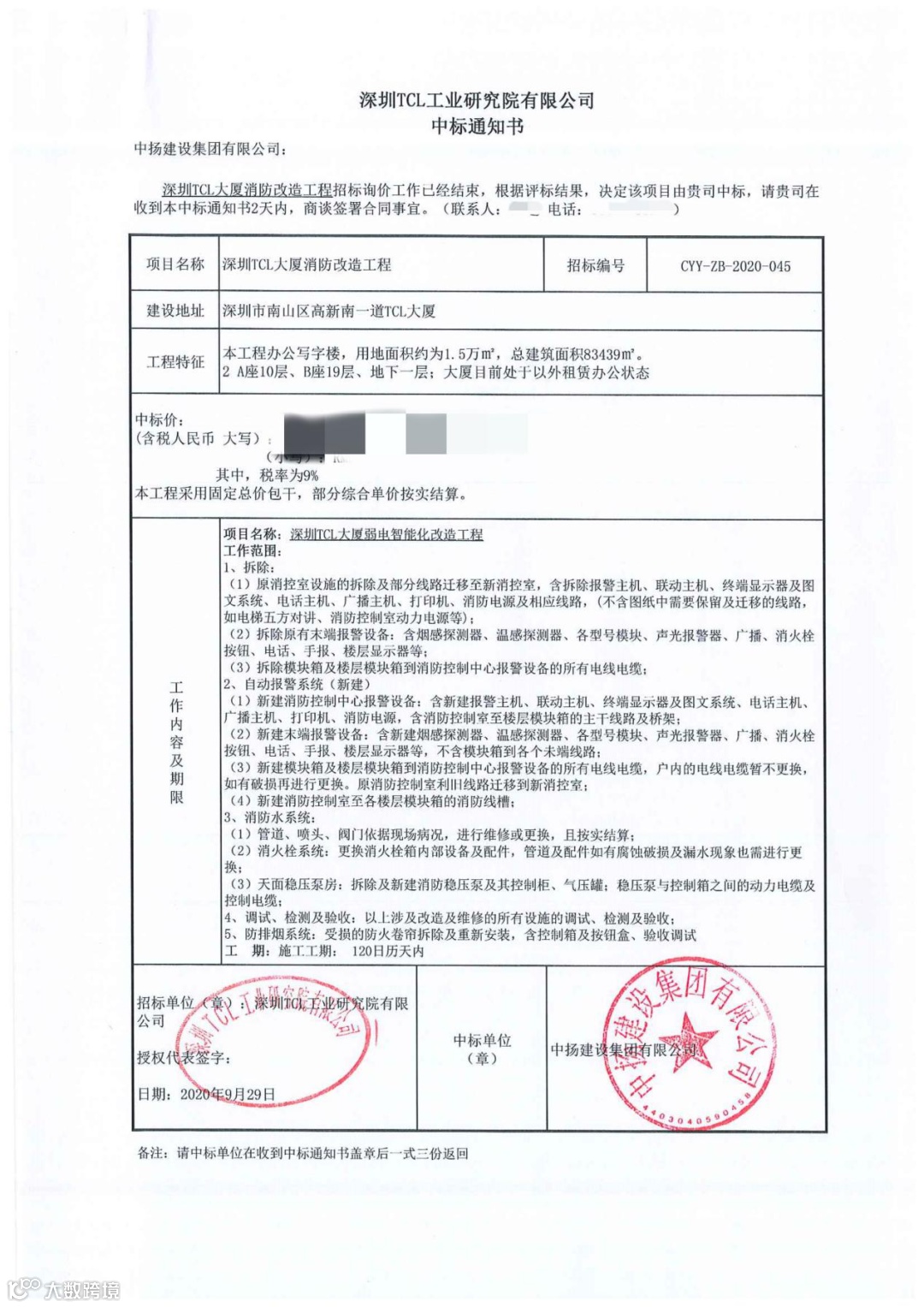 2020年9月29日,中扬集团继中标TCL华星光电华星科技工业园消防工程、TCL合肥仓储物流项目消防工程后,再接再厉又中标深圳TCL大厦消防改造工程!