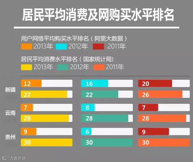 有趣的是,以2013年的排名来看,部分边疆省份出现了网络平均购买排名大幅超过居民平均消费排名的情况。其中,云南、贵州、新疆是两项排名差异最大的前三省份。这三省的居民平均消费水平分别为第28位、30位和27位,但其用户网络平均购买水平排名分别为第7位、第9位和第12位。是不是觉得很出人意料?