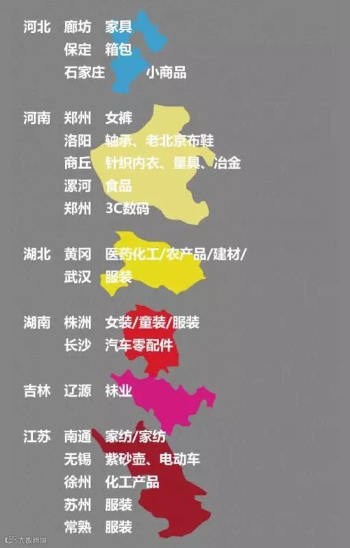 淘宝村、产业带听过去都是东部省份的事。其实不然,中部地区也早已看到无限商机。从产品结构上看,东部地区以消费品和轻工业为主,如浙江嵊州的领带,广东河源的手机;中部以资源型集群为主,如湖南株洲的铅锌硬质合金、湘潭的槟郎加工;东北仍保留有较重的计划经济痕迹,以重工业为主,如辽宁开原的起重机制造等。