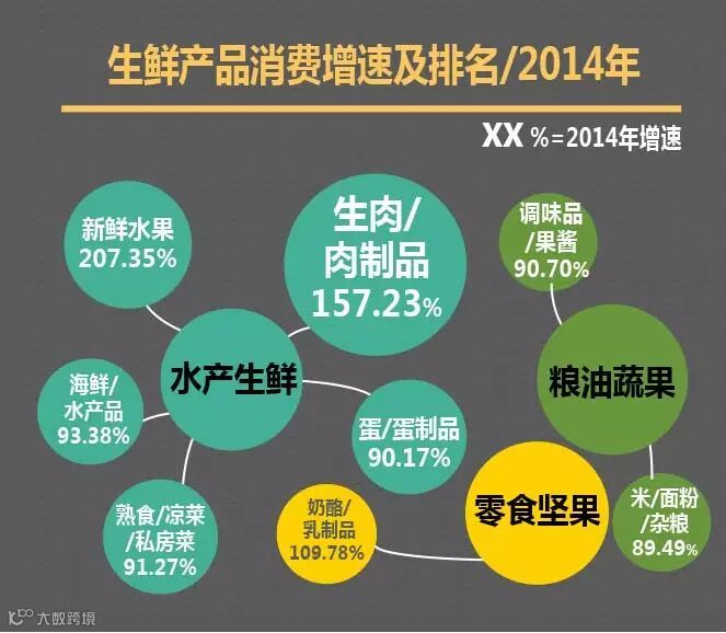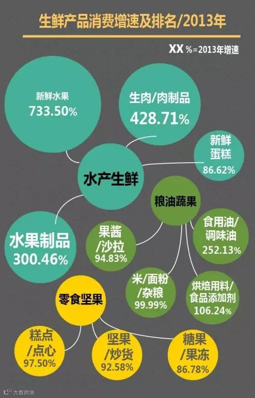 当冷链建设升级了物流产业链之后,水产生鲜的销售业绩增速傲人,成为新的热点。以阿里大数据观察,2013年多个生鲜品类的涨幅惊人。数据显示,新鲜水果的销售增幅超过700%,而生鲜肉制品的增幅也超过了400%。到了2014年,这两类的增幅较上一年有所下降,分别为200%和150%左右,但销售规模在阿里的行业排名中仍然靠前,为28和58名。