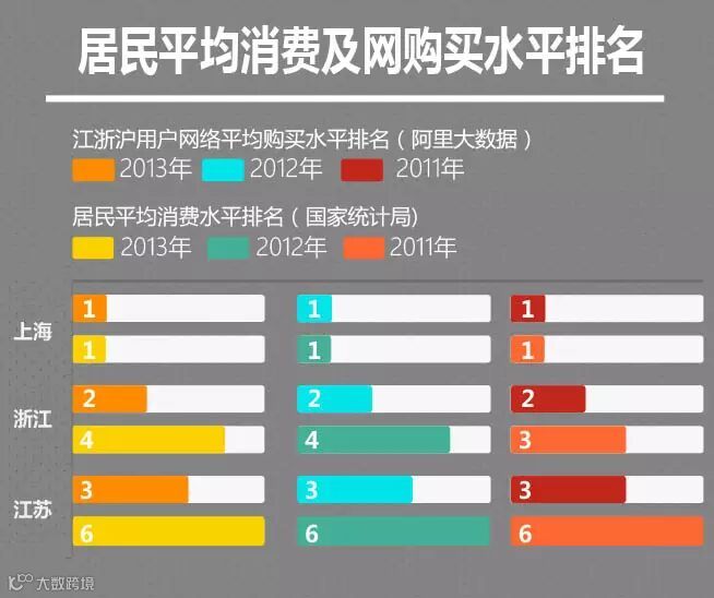根据阿里大数据,2013年用户网络平均购买水平的排名前三分别是上海、浙江、江苏。将2013年用户网络平均购买水平的分地区排名排名同来自国家统计局居民平均消费水平的分地区排名放在一起,你或许能看出一些结构差异。