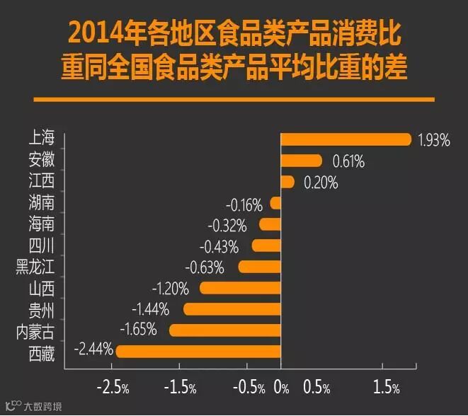 2014年,上海、安徽、江苏等长三角地区食品类产品消费比重都高于全国食品类产品消费平均值,表明这些地区的居民将更多的消费倾注到食品采购上。