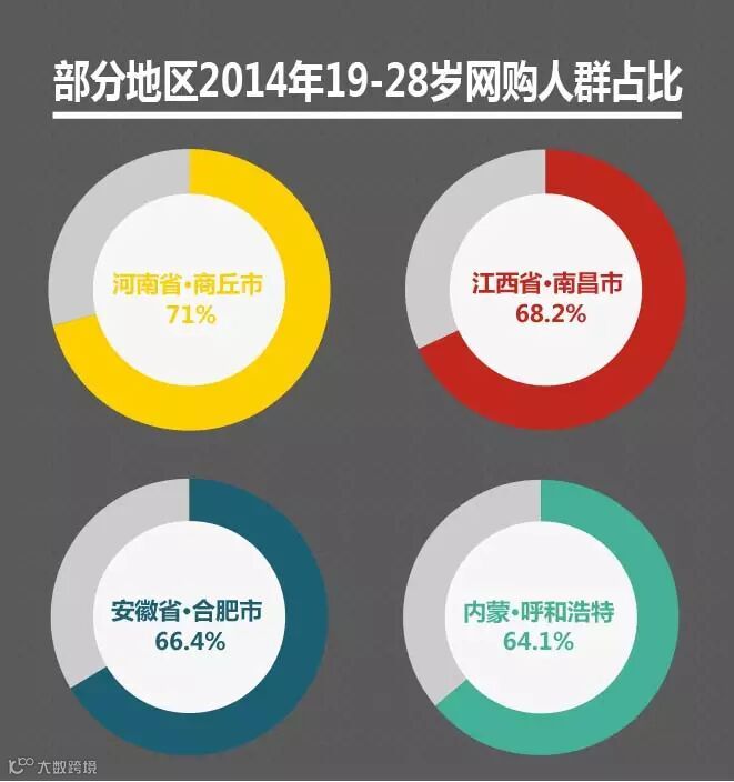 根据阿里大数据的统计,这样的城市大多出现在中部地区。这些城市网购消费人群中有近六成在19-28岁年龄段,而全国平均的比重只有约44.1%左右。