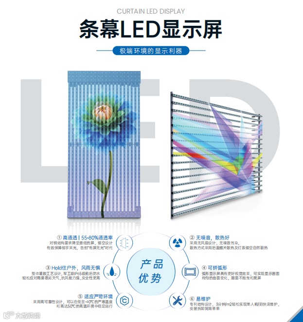康硕展户外条幕系列对钢结构要求降至最低的屏,是极端环境显示的利器,较常规箱体式显示屏轻65%,通透率高达80%,操作简化,安装维护超简、运输快捷方便,大量节省复杂交易环节流程。灯条可单独拆换,采用前后维护方式,非专业人士也可进行屏体的安装和拆卸;可适用于高湿度、高盐化、强紫外线、高低温等恶劣环境。