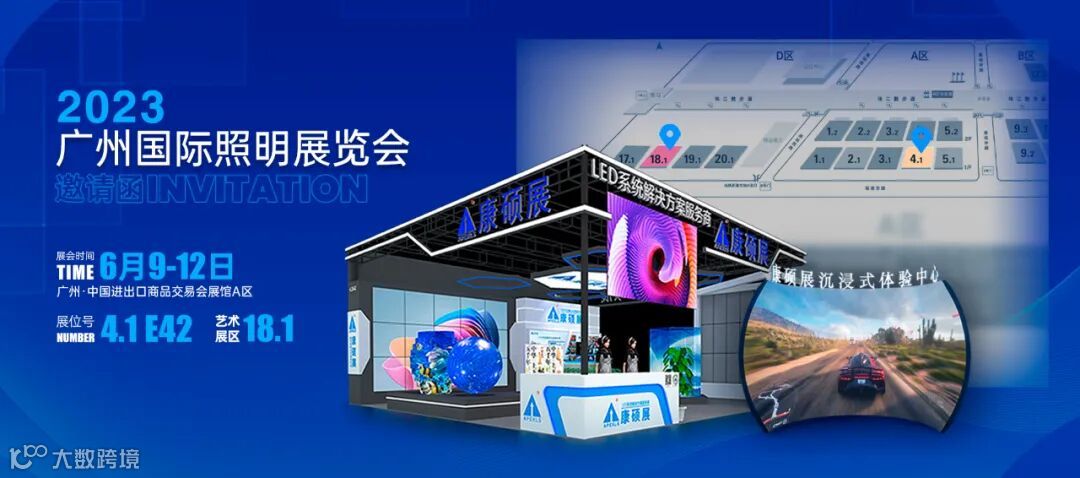2023年6月9-12日,康硕展应邀参加广州国际照明展览会(光亚展),康硕展将携沉浸式内球幕、创意产品系列及户外产品系列亮相展会,展位号是18.1馆光艺术展区D45及4.1馆E42,欢迎新老客户莅临参观指导。
