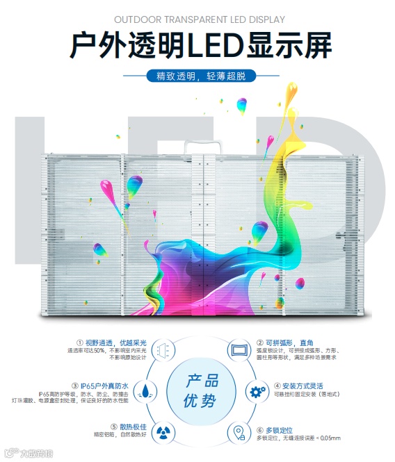 康硕展户外透明屏,采用全防水箱体设计,IP66防水,安装简易,支持前后维护。可拼接多种样式,现场将有拼接的五边形展出。