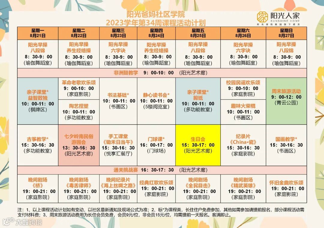 在阳光人家广州康养社区,阳光爸妈们的退休生活每天都在多姿多彩的上演,让阳光爸妈的生活充实感拉满,令人羡慕,本周课程活动计划已上新,请随家宝一起来感受阳光人家的乐养生活。