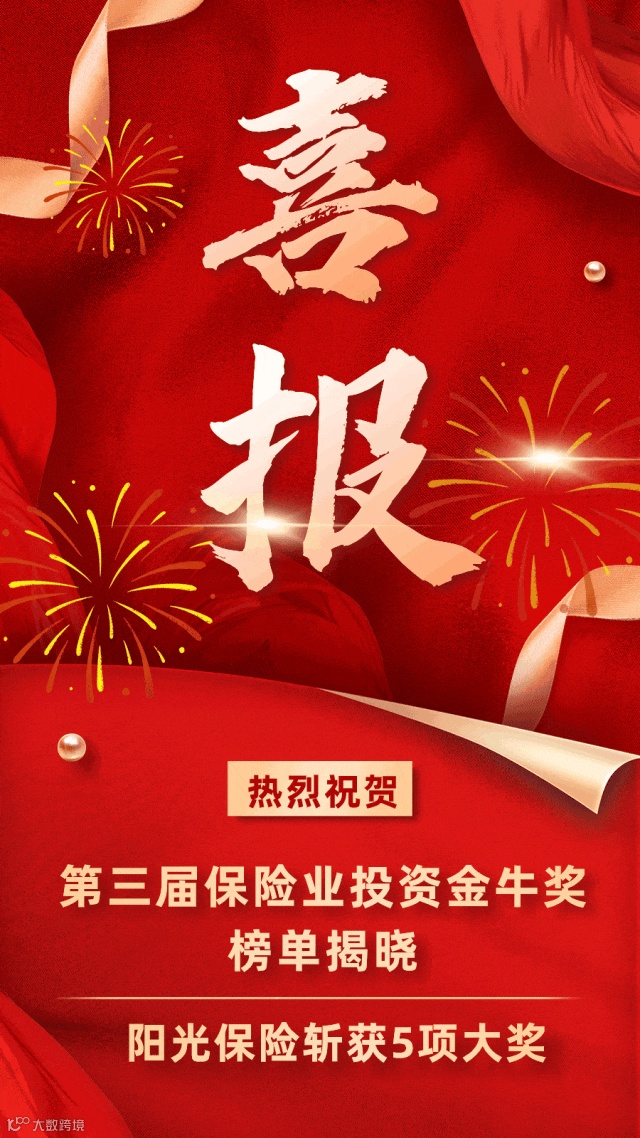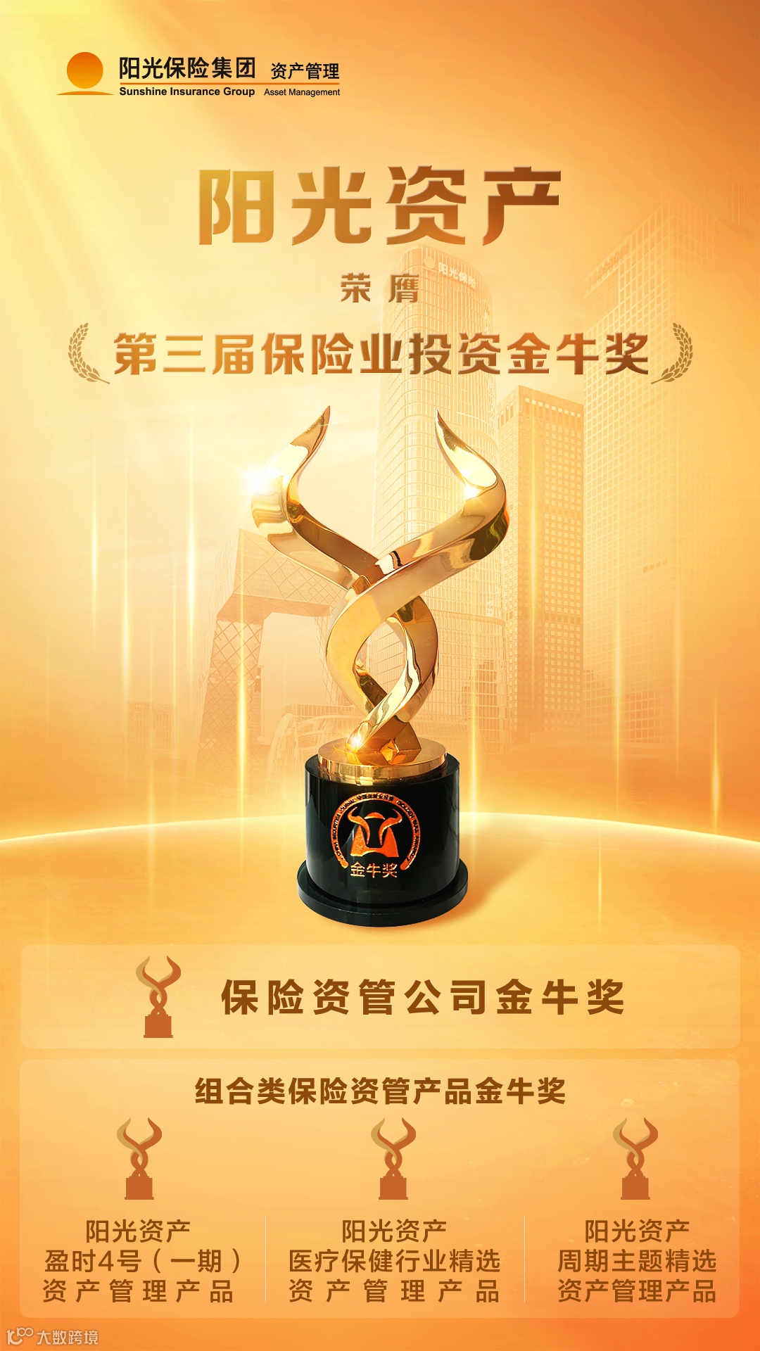11月11日,由中国证券报主办的“聚合力 育新质 启新程——2023银行保险业财富管理论坛”在京召开,“第三届保险业投资金牛奖”榜单揭晓。阳光保险集团旗下阳光人寿与阳光资产凭借出色的投资管理能力一举拿下五项大奖。其中,阳光人寿与阳光资产分别荣获“保险业投资金牛奖”、 “保险资管公司金牛奖”;阳光资产旗下三支产品分别荣膺“组合类保险资管产品金牛奖”,产品具体为“阳光资产-盈时4号(一期)资产管理产品(固收)”、“阳光资产-医疗保健行业精选资产管理产品(权益)”、“阳光资产-周期主题精选资产管理产品(权益)”。