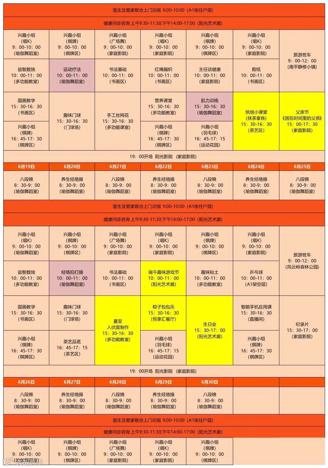 今日份阳光人家六月活动计划表上新了,本月有重磅活动等着家人们,童趣野餐、芒种农家菜、端午趣味游戏节、粽子包包乐、感人父亲节、居民茶话会等等。