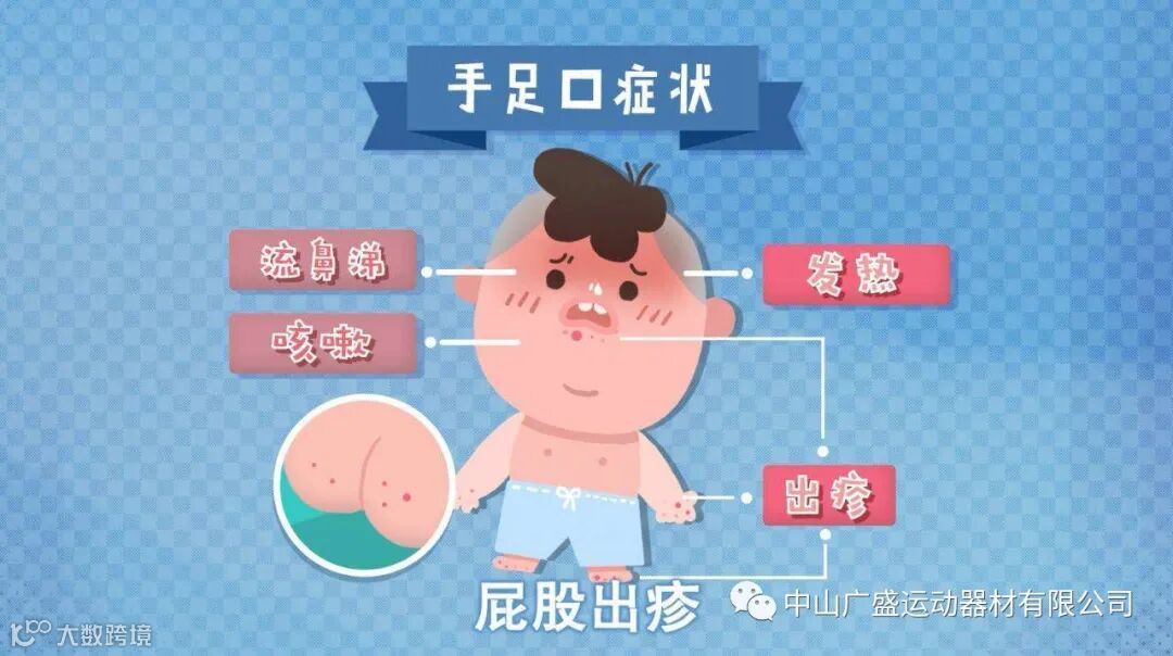 手足口病潜伏期多为2~10天,平均3~5天。在发病早期,患者常表现为疲倦、食欲下降、有低热、身体不适、腹痛等症状。发热1~2天后可在口腔黏膜出现散在疼痛性粟粒大小般的水疱,手、足、臀部等处出现红色小斑丘疹、疱疹。