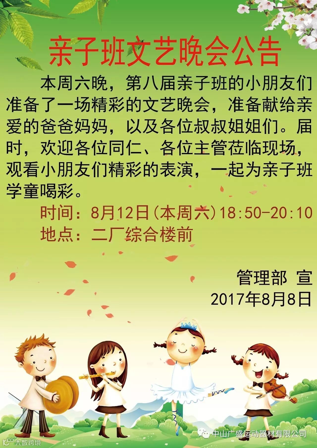广盛公司第八届亲子班文艺晚会将于8月12日(本周六)在广盛二厂综合楼前举办,广盛公司同仁福利来了哦,可以免费观看一场精彩绝伦的文艺晚会了!