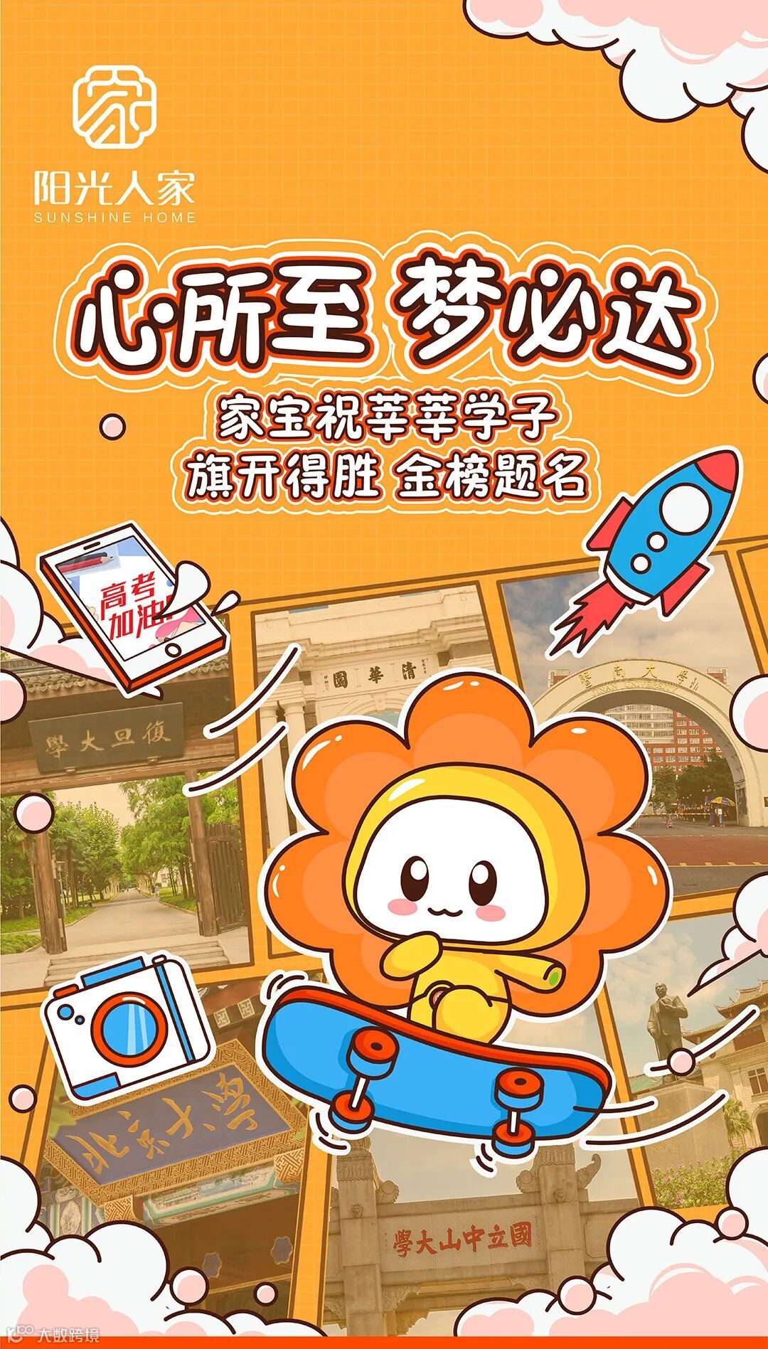 家宝由衷祝福所有坚持拼搏到赛道终点的高考生们,你们都是人生的王者,也是阳光人家所有阳光爸妈们的骄傲。今日特别策划给高考学子跳一个加油舞,另附一组高清版大学美图。锦鲤出征,高考必胜!