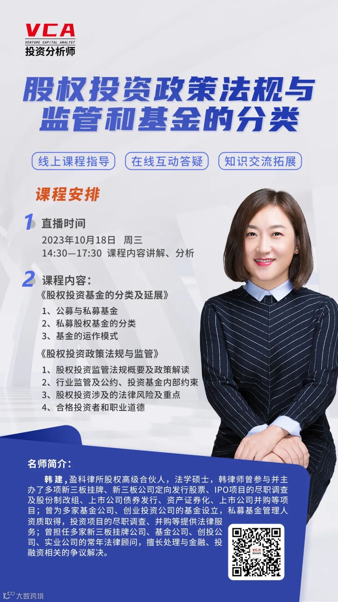 秉持着培养并认证新时期股权投资精英人才的理念,本次投资分析师VCA证书实战班10月课程,VCA认证中心特别邀请行业专家大咖,资深实战专家为学员进行深度讲解,本次课程主题为《股权投资政策法规与监管和基金分类》,老师将从7个方面为大家全面讲解,帮助大家在职业发展道路上更进一步!