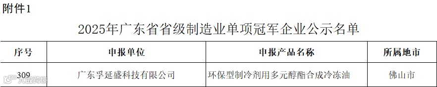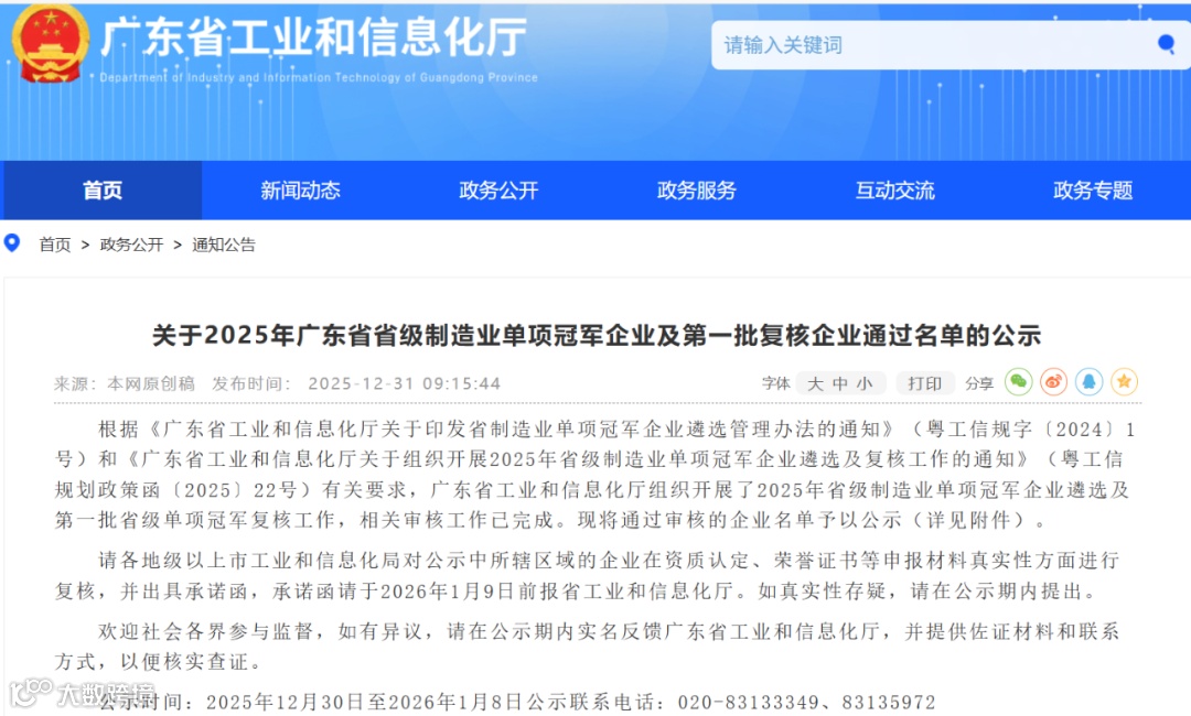 时光荏苒,岁末添喜!在2025年的最后一天,孚延盛传来重磅捷报——成功通过省级制造业单项冠军企业遴选,入选“2025年广东省省级制造业单项冠军企业”公示名单!该遴选通过名单已在广东省工业和信息化厅网站正式公示,这一荣誉的获得,是政府部门对公司专注细分领域、坚持创新引领的高度认可,更是全体孚延盛人凝心聚力、深耕细作的丰硕成果!