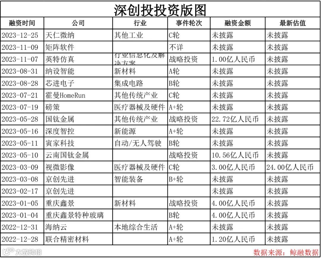 其中,2023年度,据鲸融数据口径统计,深创投共计投出14个项目,其中战略投资3个,A轮1个,A+轮2个,B轮3个,B+轮1个,C轮2个及其他不详轮次。