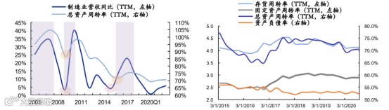 (1)左图可以看到:从2016年开始供给侧改革,制造业的营业收入是下行的。但总资产周转率却在2019年出现拐点,从整体来看制造业营收不理想,但其产能利用率却在大幅提高。这表明,制造业内部的产业结构发生了变化,即低毛利不赚钱的制造业被淘汰,而高利润赚钱的制造业起来了。