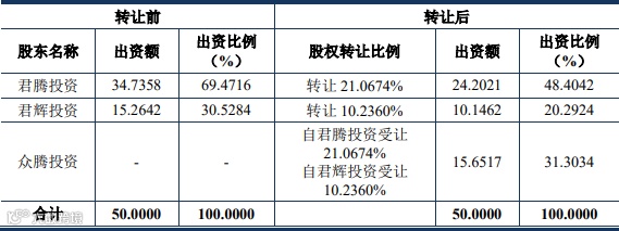 2015年9月,公司为平衡实际控制人家族内部利益分配及其好友个人投资需求,设立深圳市众腾投资企业(有限合伙)作为持股平台(以下简称“众腾投资”),同意股东君辉投资将其持有公司10.2360%的股权以人民币5.1180万元转让给众腾投资,股东君腾投资将其持有公司21.0674%的股权以人民币10.5337万元转让给众腾投资。转让完成后,公司股权结构如下: