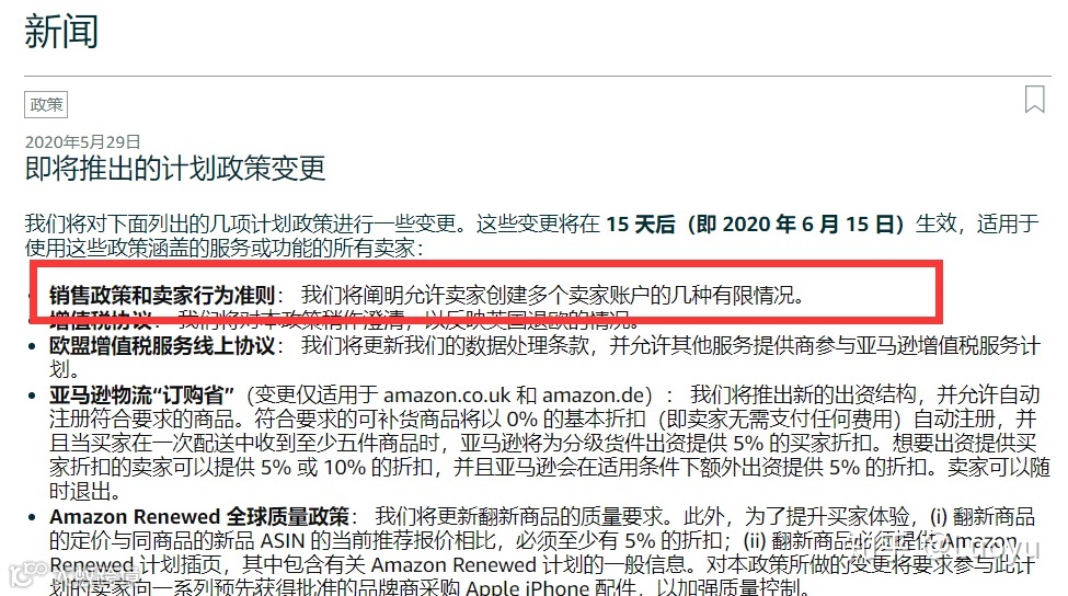 第一,指望电商平台去解决问题,有没有可能呢?也不是完全没有这样的可能。比如亚马逊不严防死守底线!来源于网络上的新闻显示,最近卖家后台的新闻版块更新了这么一个公告,称将会在2020年6月15日实施新版销售政策和卖家行为准则,将会在几种有限的情况下,允许卖家持有多个账号。