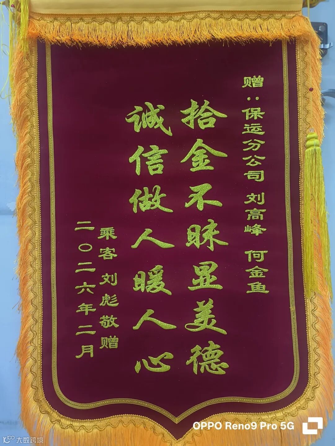 不久,焦急万分的失主通过多方辗转联系上车队。经仔细核对信息无误后,双方约定次日交接。第二天,何金鱼、刘高峰如约将钱包完好无损交还失主。面对失而复得的财物,失主感动不已,特意送来锦旗,向两位师傅的高尚品德致以诚挚谢意。