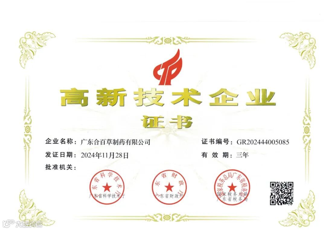 喜讯!广东合百草再次荣登高新技术企业之列。
