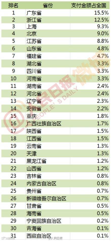 支付宝发布了十年对账单,同时也公布了各省市2014年(截至2014年10月31日)的最新支付情况:①全国人民十年网络支出423亿笔;②“最土豪五省市”:广东、浙江、上海、北京和江苏;③80后是申购余额宝的中坚力量,人数占43.9%,90后是第二大群体,占33.2%。