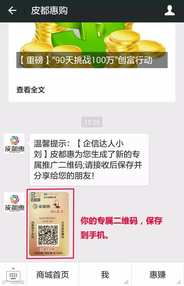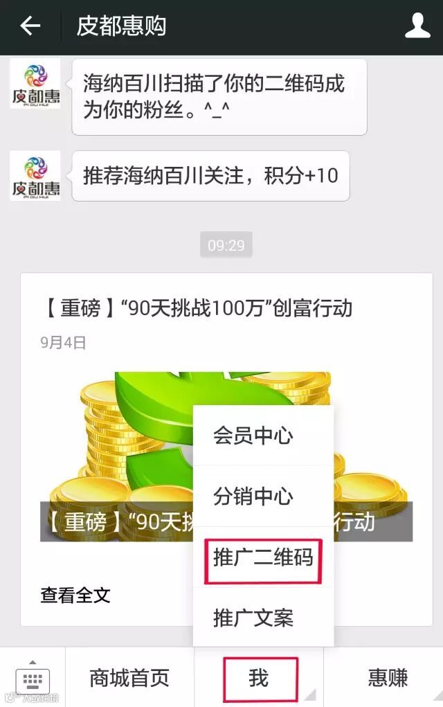 导读:如何快速复制模式进入【皮都惠购】公众号点击【我】,点击【推广二维码】大约30秒,系统自动生成一个你的专属推广
