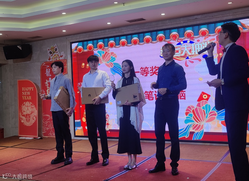 除了游戏环节,抽奖也是年会的一大亮点。公司准备了丰富的奖品,包括华为mate60手机、华为笔记本电脑、华为智能运动手表、格力智能电饭煲、芝华士足部按摩器、现金红包等等。每个奖项都吸引了许多员工的关注和期待。在抽奖环节中,我们通过随机抽取的方式选出幸运的员工,并颁发奖品以示鼓励。
