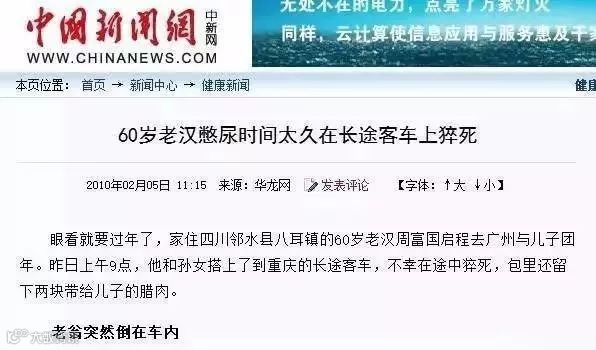 事例2:此外,第四军医大学西京医院神经内科教授粟秀初回忆:在一年的春节前,接诊了一名因在排队买单时过度憋尿而引发大面积脑出血而猝死的老年女病人。
