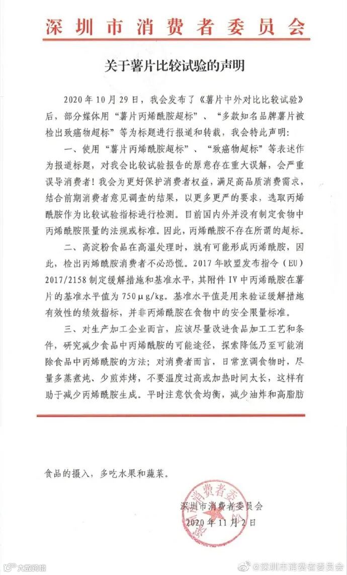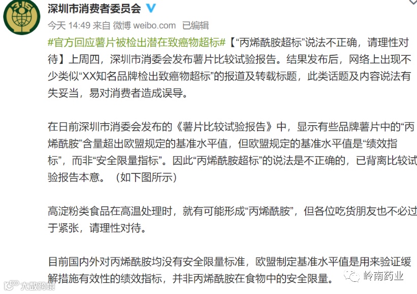 在日前深圳市消委会发布的《薯片比较试验报告》中,显示有些品牌薯片中的“丙烯酰胺”含量超出欧盟规定的基准水平值,但欧盟规定的基准水平值是“绩效指标”,而非“安全限量指标”。因此“丙烯酰胺超标”的说法是不正确的,已背离比较试验报告本意。